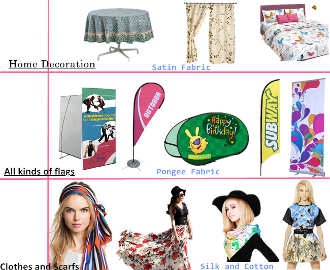 Basılı kumaşların basılması ve ısıtılması için Mutoh, Mimaki ve Roland gibi piezo yazıcılarla birlikte çalışarak, tamamlanan kumaş bayrak baskısı, afiş poster baskısı, tekstil dijital baskısı, halı dijital baskısı, pencere perdesi dijital baskısı ve iç tasarımı dekorasyon baskı, iç ve dış baskı vb.